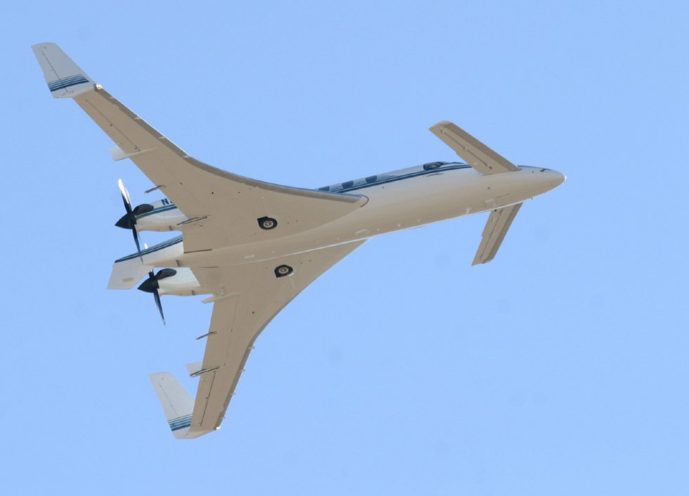 Turns out it is a Burt Rutan-designed Beech Starship from the 1980s. It was not successful and less than 100 were built. Raytheon decommisioned the Starships last year because they were too expensive to maintain and offered owners a King Air in exchange, but pilot Robert Scherer didn't want to give his up, so he uses it as the SpaceShipOne chase plane. He's got a website with photos of the plane.