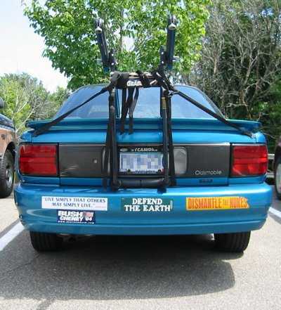 What is the story with this car? Did the owner buy it used, with the environmental stickers already attached? Is the owner being ironic? Perhaps he's one of those "crunchy" conservatives, who cares about the environment (but in that case, what's he doing voting for Bush?). Or maybe the owner is a triffle confused. Or an idiot.